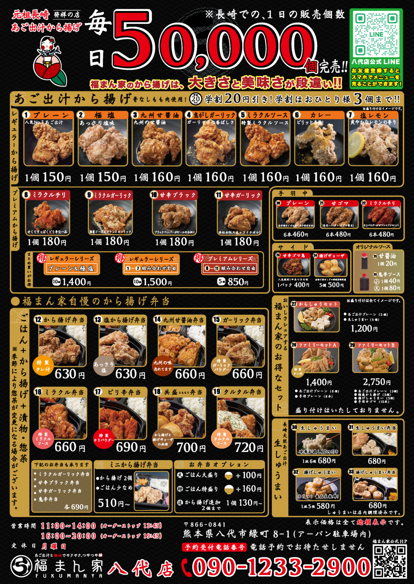 SHOP 八代店 営業時間 ※詳細は店舗にお問合せ下さい。 11:00~14:00 16:00~20:00定休日:月曜日 ※月曜日が祝日の場合は営業致します。 住所 熊本県八代市緑町8-1TEL. 090-1233-2900